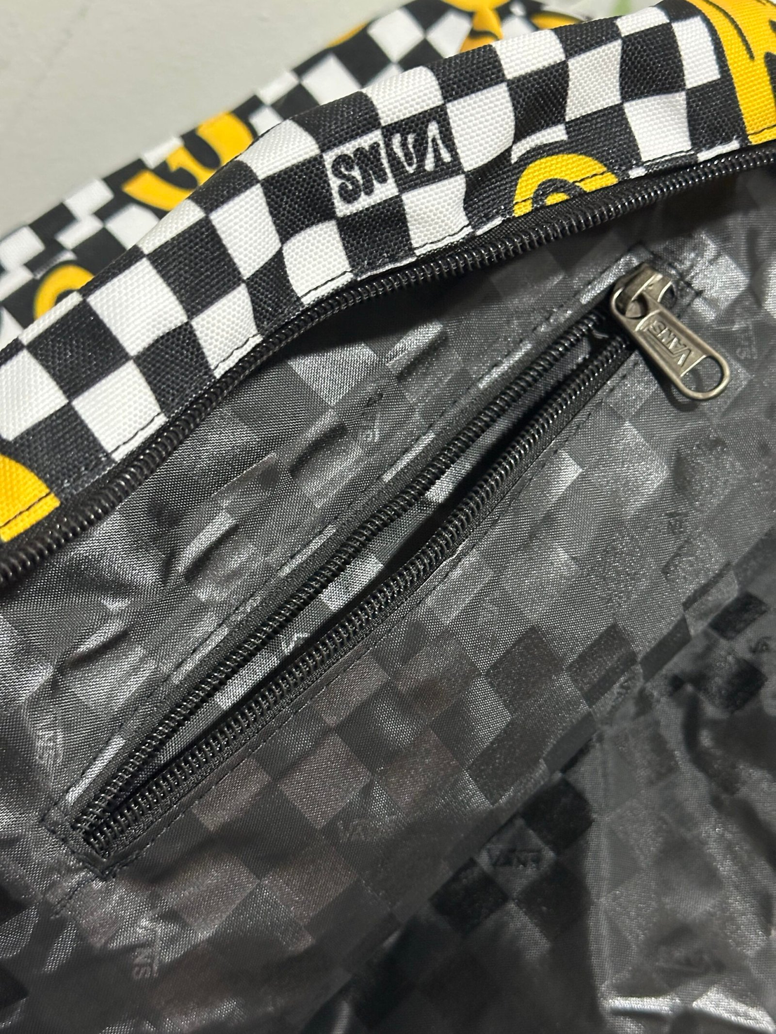 Diseño checkerboard con emojis amarillos original de Vans.