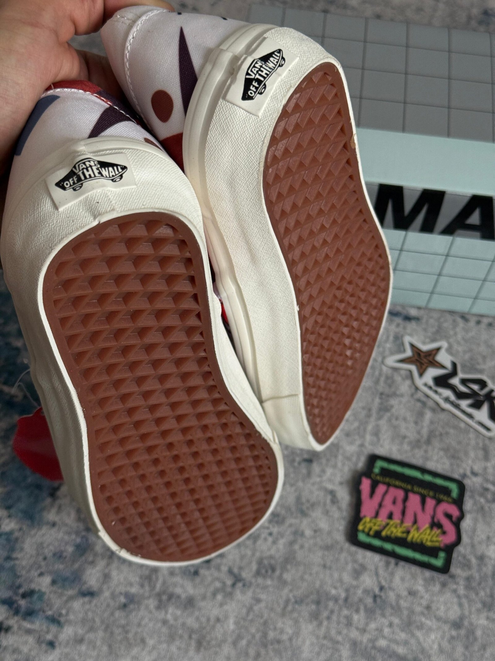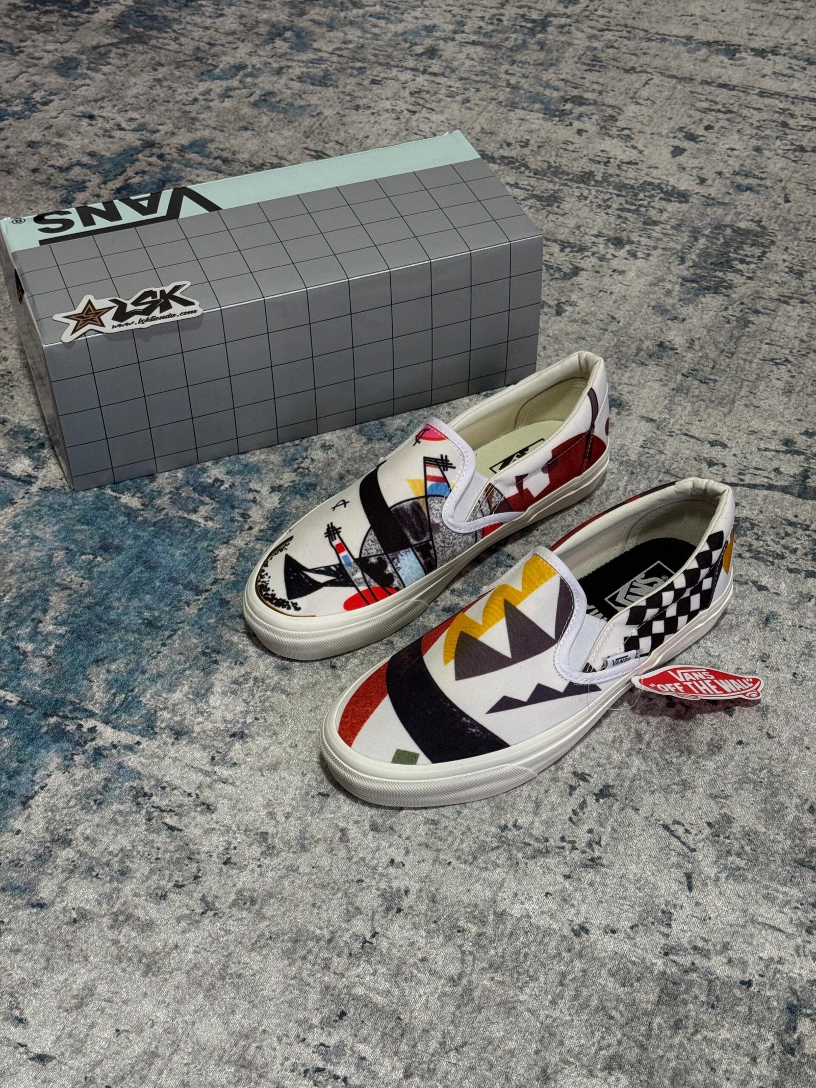 Con su silueta Slip-On clásica, ofrecen un calce fácil, suela firme y una estructura cómoda, perfecta para destacar sin esfuerzo en cualquier ocasión. Su color base blanco permite que los patrones en rojo, azul, negro y amarillo se roben todas las miradas.